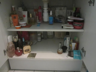 Enfin fini les fouillis dans la salle de bains. Tout à sa place. Les produits pour les cheveux ont fait une réunion. Il regardent de loin le gang des flacons de parfums. Les crèmes et les masques se sont cachées pour éviter la bagarre.